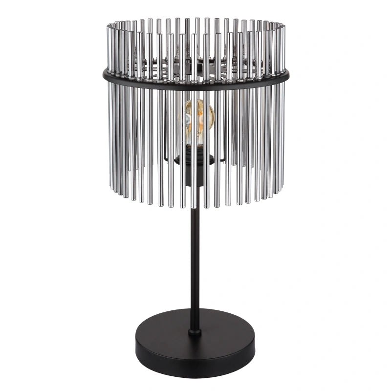 - Lampada da tavolo metallo nero satinato, bacchette di vetro color fumè, cavo PVC nero, interruttore a levetta sul cavo