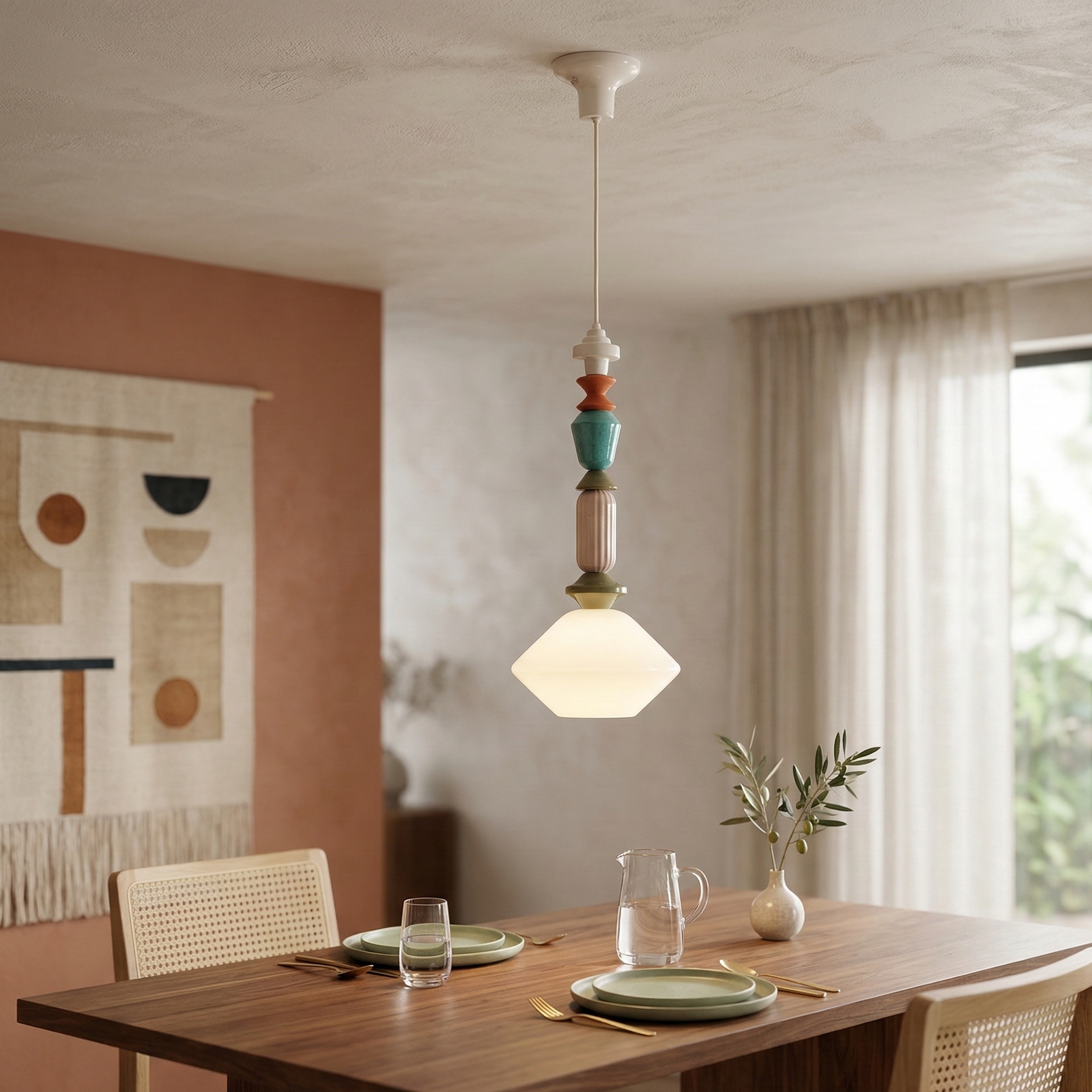 Gemma è una lampada a sospensione che trasforma l'illuminazione in un'opera d'arte scultorea. Caratterizzata da un design che richiama l’estetica post-moderna e il movimento Memphis Milano, questa lampada gioca con volumi e colori per creare un equilibrio visivo dinamico e sofisticato.