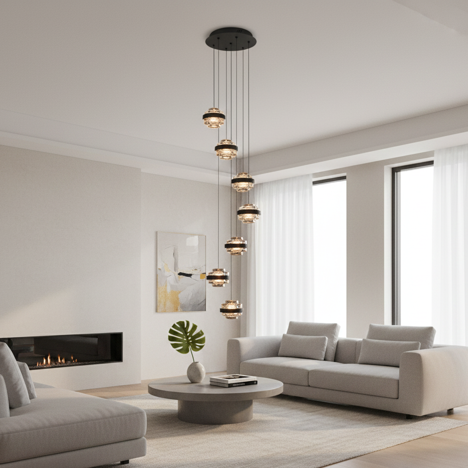 Geo è una lampada a sospensione dal design moderno ed elegante, caratterizzata da una forma rotonda e da una finitura pulegosa in acrilico che diffonde la luce in modo morbido e uniforme. La sospensione è dotata di 7 LED integrati da 35W che garantiscono un'illuminazione potente e a basso consumo energetico. La temperatura colore di 3000K crea un'atmosfera calda e accogliente, perfetta per qualsiasi ambiente.