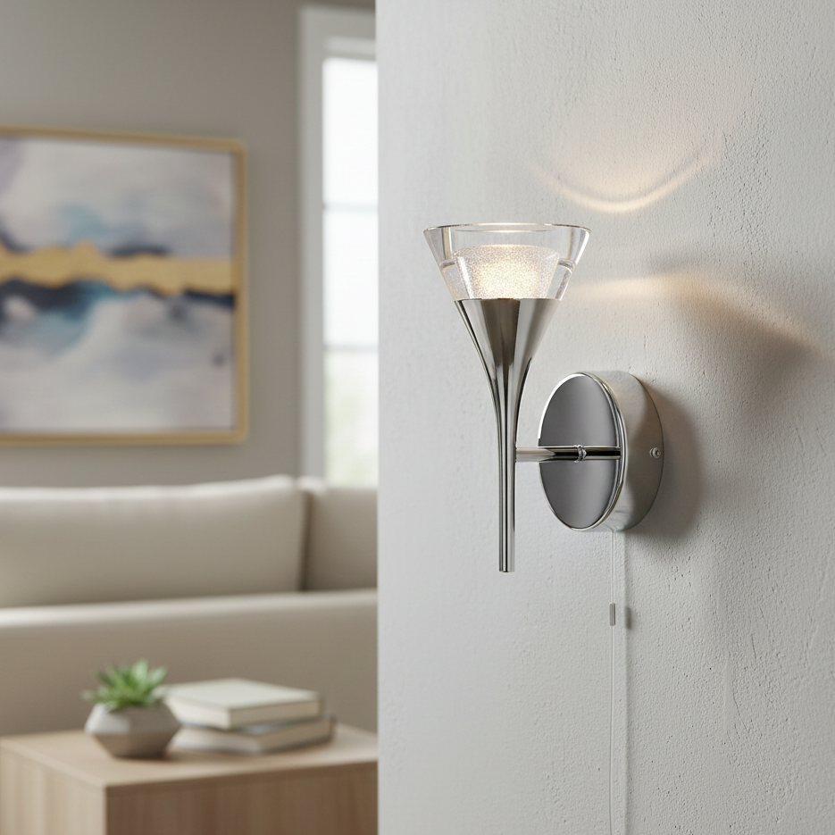 Gioiello è una lampada a parete dal design classico ed elegante, realizzata con materiali di alta qualità come il vetro lavorato a mano e il metallo cromato. Il suo diffusore in vetro, sapientemente lavorato a mano, cattura la luce e la diffonde creando un'atmosfera calda e accogliente. La montatura in metallo cromato dona un tocco di raffinatezza alla lampada,rendendola un complemento d'arredo perfetto per qualsiasi ambiente, dal soggiorno alla camera da letto.
