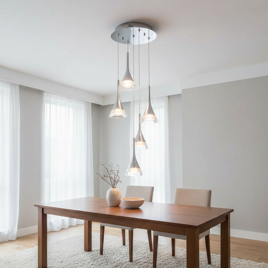 Gioiello è una sospensione a 5 luci dal design elegante e scenografico. I diffusori in vetro lavorato a mano catturano la luce e la diffondono in modo omogeneo, creando un effetto scintillante e abbagliante che cattura l'attenzione in qualsiasi ambiente. La montatura in metallo cromato dona alla sospensione un aspetto lussuoso e ricercato. La sospensione è dotata di 5 lampadine LED integrate a luce calda (3000K) dimmerabili, che permettono di regolare l'intensità della luce in base alle proprie esigenze. L'altezza della sospensione è regolabile, permettendo di adattarla alle proprie esigenze di illuminazione.