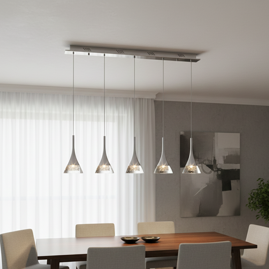 Gioiello Lineare 5 Luci è una sospensione dal design lineare e moderno che si contraddistingue per la sua forma slanciata e l'abbinamento di cromo e vetro lavorato a mano. I diffusori in vetro diffondono la luce in modo omogeneo,creando un'atmosfera calda e accogliente in qualsiasi ambiente. La sospensione è dotata di 5 lampadine LED integrate a luce calda (3000K) dimmerabili, che permettono di regolare l'intensità della luce in base alle proprie esigenze. L'altezza della sospensione è regolabile, permettendo di adattarla alle proprie esigenze di illuminazione.