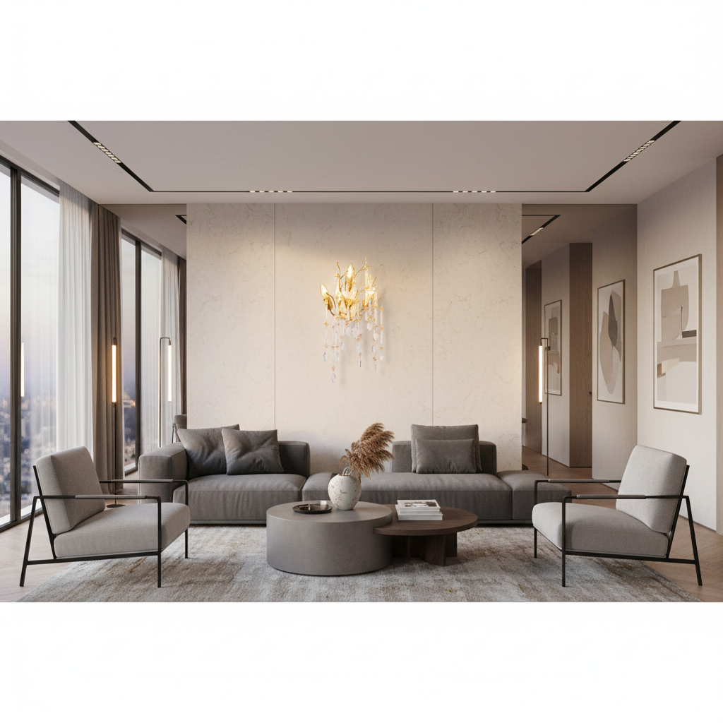 L'applique Gloria non è solo un corpo illuminante, ma un vero e proprio gioiello d'arredo che trasforma il soffitto in un giardino di cristallo.