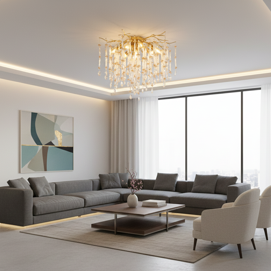 La plafoniera Gloria non è solo un corpo illuminante, ma un vero e proprio gioiello d'arredo che trasforma il soffitto in un giardino di cristallo.