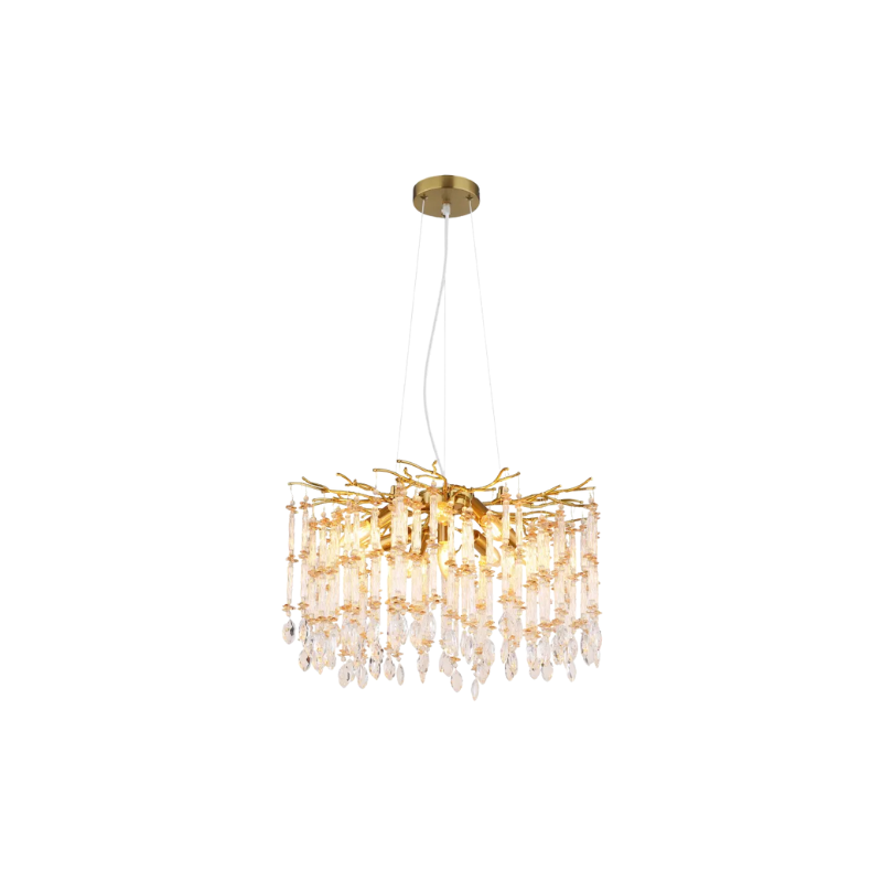 Lampadario a candelabro metallo color oro satinato, cristalli di vetro trasparente,
