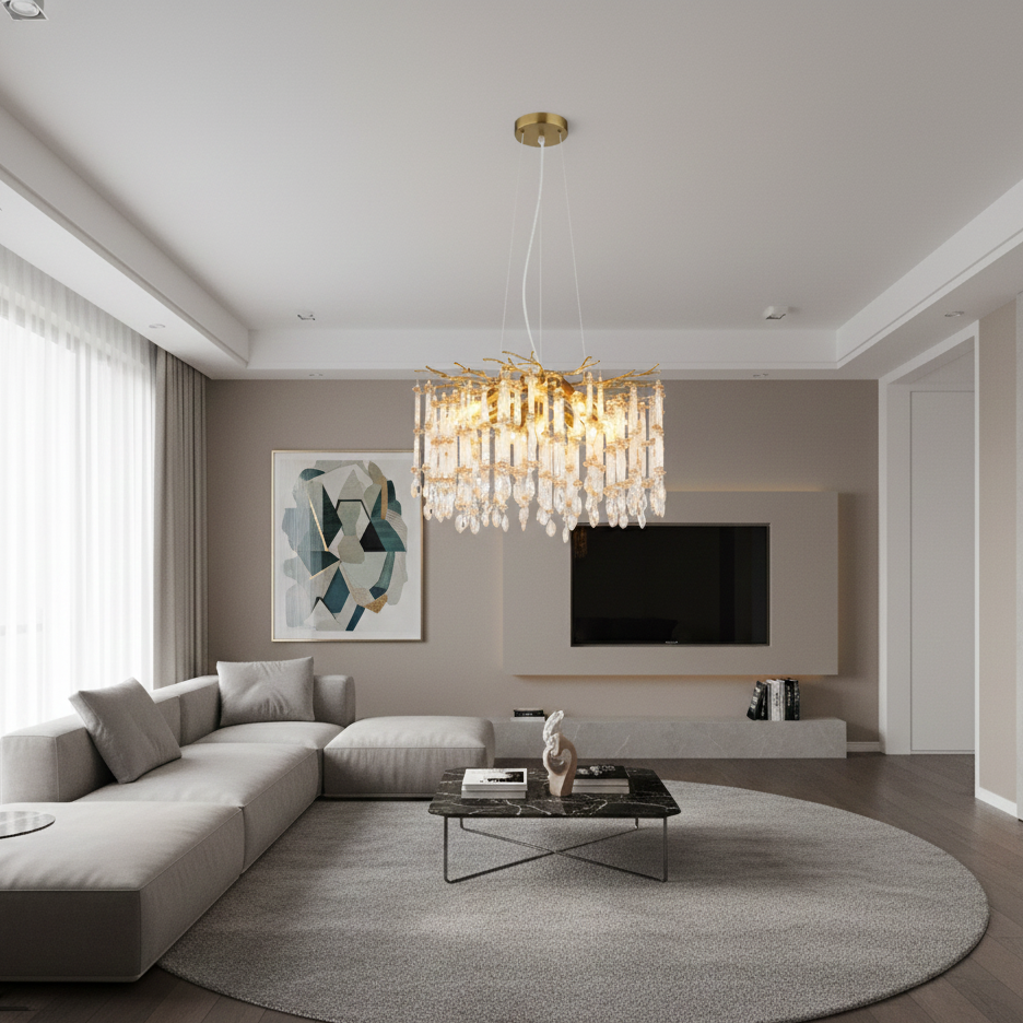 La sospensione Gloria non è solo un corpo illuminante, ma un vero e proprio gioiello d'arredo che trasforma il soffitto in un giardino di cristallo.