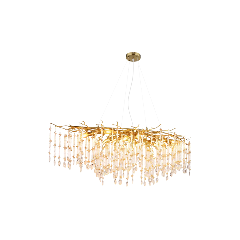- Lampadario a candelabro metallo color oro satinato, cristalli di vetro trasparente, ambra, cavo PVC Trasparente, Altezza riducibile