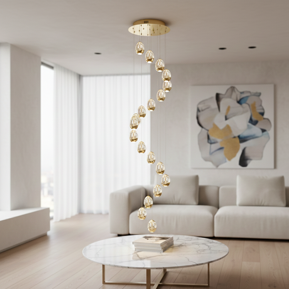 Golden Egg è una sospensione a 14 luci dal design elegante e scenografico che si contraddistingue per la sua forma a uovo stilizzata e la combinazione di cristallo pulegoso e metallo. I 14 diffusori in cristallo pulegoso catturano la luce e la diffondono in modo omogeneo, creando un effetto scintillante e abbagliante che cattura l'attenzione in qualsiasi ambiente. La sospensione è dotata di 14 lampadine LED integrate a luce calda (3000K) dimmerabili, che permettono di regolare l'intensità della luce in base alle proprie esigenze. L'altezza della sospensione è regolabile, permettendo di adattarla alle proprie esigenze di illuminazione.
