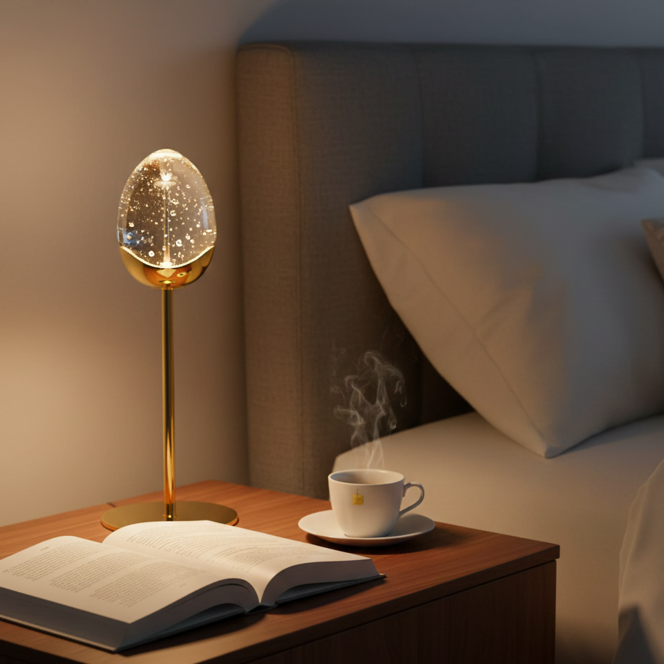 Golden Egg è un lumetto dal design classico ed elegante, realizzato con materiali di alta qualità come il cristallo pulegoso e il metallo. La sua forma a uovo stilizzata e la luce calda e accogliente lo rendono un complemento d'arredo perfetto per qualsiasi ambiente, dal soggiorno alla camera da letto.