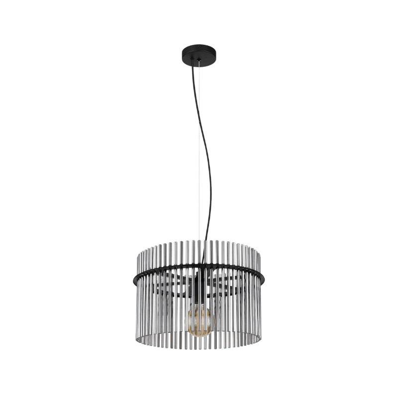 - Sospensione metallo nero satinato, bacchette di vetro color fumè, cavo PVC nero, altezza riducibile