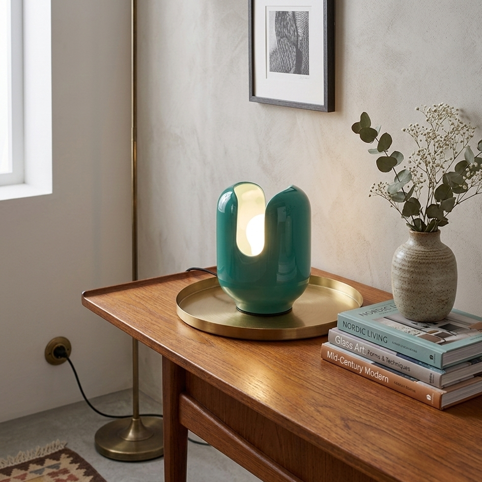 Questa lampada da tavolo è un vero e proprio pezzo d'accento che fonde estetica Space Age e calore domestico. Caratterizzata da una silhouette scultorea a "U" rovesciata, la lampada è realizzata in vetro soffiato.