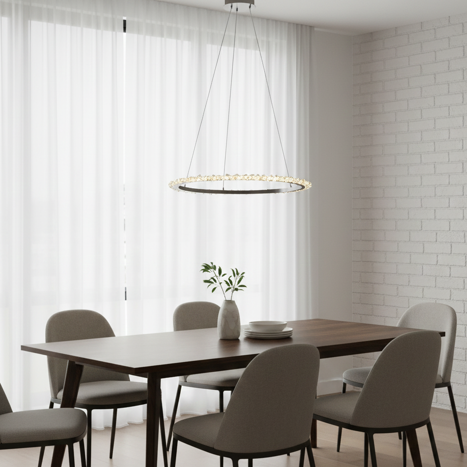 Halo Aureola è una sospensione singola dal design moderno ed elegante che si contraddistingue per la sua forma circolare e la presenza di cristalli di quarzo fissati all'interno di un cerchio di metallo satinato. I cristalli di quarzo catturano la luce e la diffondono in modo omogeneo, creando un'atmosfera calda e accogliente con un effetto luminoso che ricorda un'aureola. La sospensione è dotata di una lampadina LED integrata da 34 Watt a luce calda (3000K) dimmerabile, che permette di regolare l'intensità della luce in base alle proprie esigenze.