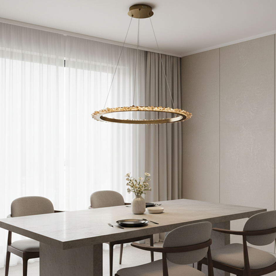 Halo Aureola è una sospensione singola dal design moderno ed elegante che si contraddistingue per la sua forma circolare e la presenza di cristalli di quarzo fissati all'interno di un cerchio di metallo satinato. I cristalli di quarzo catturano la luce e la diffondono in modo omogeneo, creando un'atmosfera calda e accogliente con un effetto luminoso che ricorda un'aureola. La sospensione è dotata di una lampadina LED integrata da 34 Watt a luce calda (3000K) dimmerabile, che permette di regolare l'intensità della luce in base alle proprie esigenze.