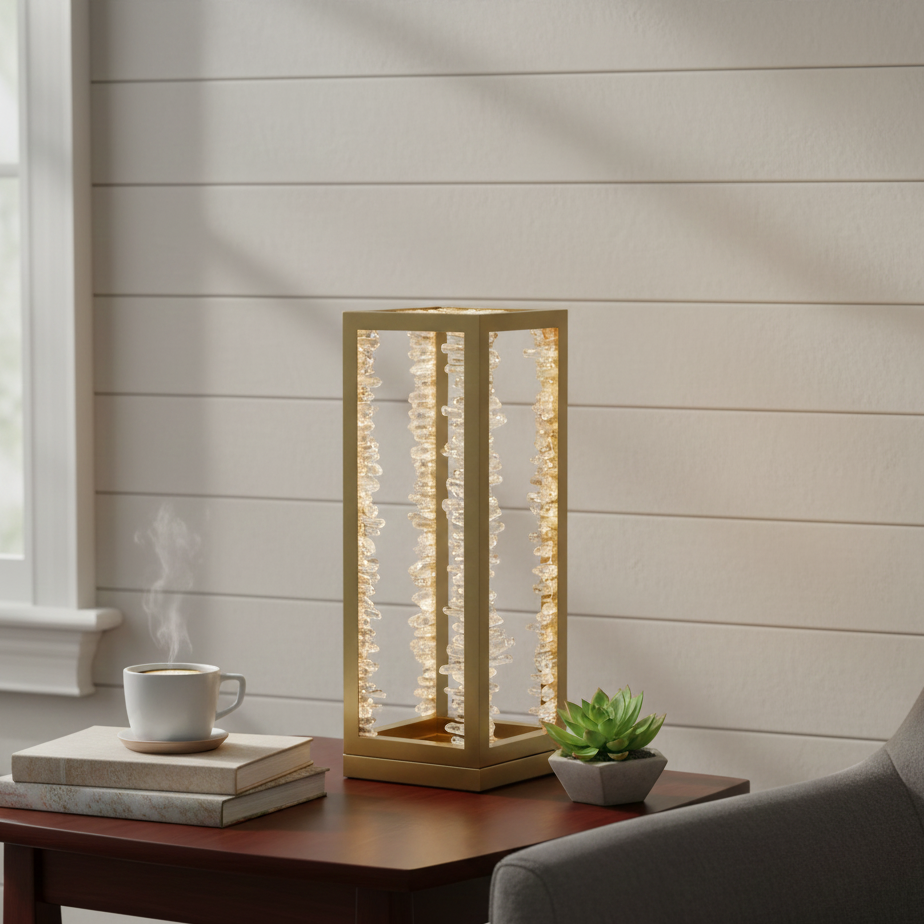 Halo Splendore è una lampada da tavolo dal design moderno ed elegante che si contraddistingue per la sua forma rettangolare e la presenza di elementi in quarzo naturale che impreziosiscono la struttura in metallo finitura oro o cromo satinato. La luce LED integrata a 3000K crea un'atmosfera calda e accogliente, diffondendosi in modo omogeneo grazie ai cristalli di quarzo. La lampada è dimmerabile, permettendo di regolare l'intensità della luce in base alle proprie esigenze.