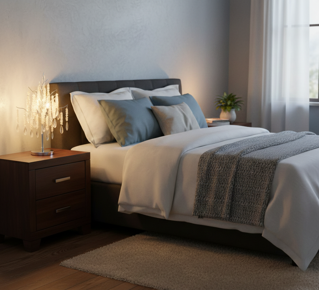 - Lampada da tavolo metallo color argento satinato, cristalli di vetro trasparente, cavo PVC nero, Interruttore a levetta sul cavo