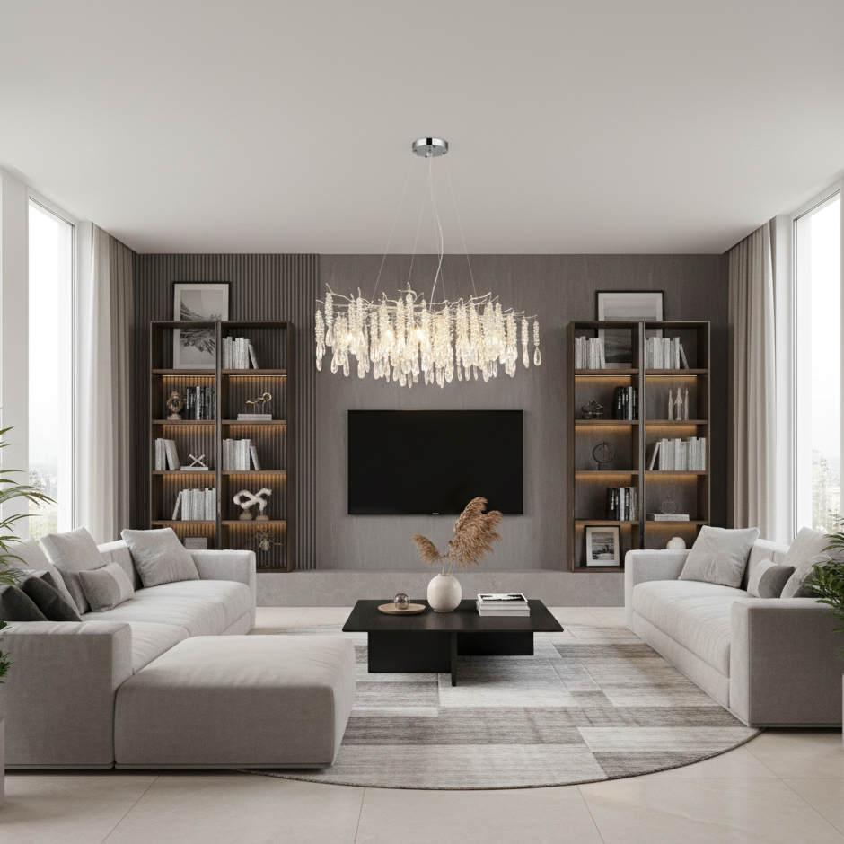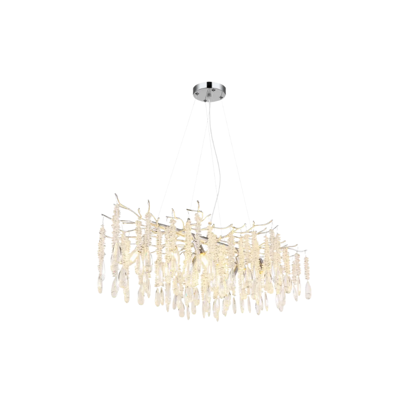 - Lampadario a candelabro metallo color argento satinato, cristalli di vetro trasparente, cavo PVC, Altezza riducibile