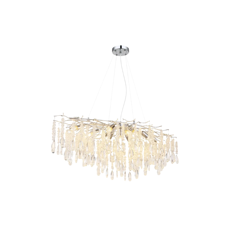 - Lampadario a candelabro metallo color argento satinato, cristalli di vetro trasparente, cavo PVC Trasparente, Altezza riducibile