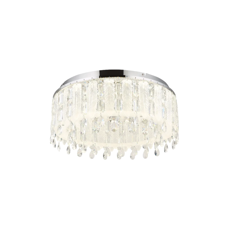 - Plafoniera metallo cromato, cristalli K5 trasparente, cristalli di vetro trasparente, Dimmerabile, Molteplici passaggi tramite interruttore a muro, Colore selezionabile, Funzione di memoria, Luce notturna, Telecomando, Batteria inclusa 2x AAA
