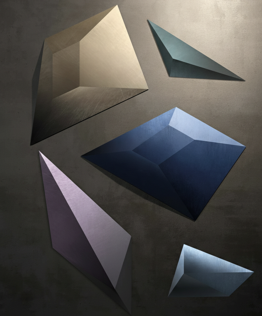 Kronos è una scultura modulare a parete che esplora il concetto di tempo attraverso la rigidità della geometria e la mutevolezza della luce.