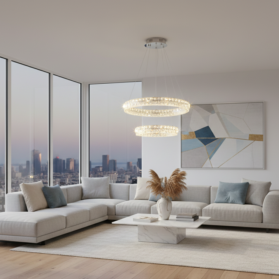 La sospensione Laurel è un vero e proprio gioiello di luce, progettato per chi desidera coniugare l'estetica moderna con il fascino intramontabile del cristallo.