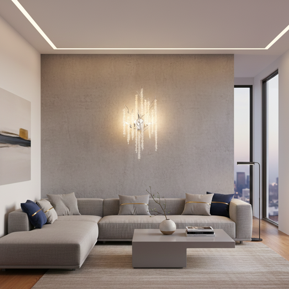 Il design si ispira alla delicatezza della natura, ricordando la fioritura di un glicine bianco o una cascata di ghiaccio scintillante. È la scelta ideale per chi cerca un elemento decorativo che unisca modernità, eleganza e un tocco di romanticismo.