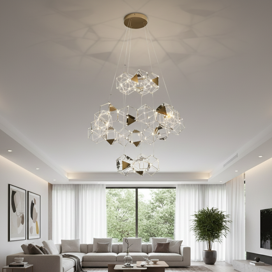 Lucciola Pro 3 Livelli una lampada a sospensione dal design moderno ed elegante che si contraddistingue per la sua struttura geometrica su 3 livelli composta da asticciole di metallo disposte in modo da creare forme triangolari e quadrangolari. I diffusori LED integrati sono fissati ad ogni incrocio delle aste, enfatizzando il design geometrico della lampada e diffondendo una luce calda e omogenea nell'ambiente. La lampada è dimmerabile da controllo remoto, permettendo di regolare l'intensità della luce in base alle proprie esigenze.