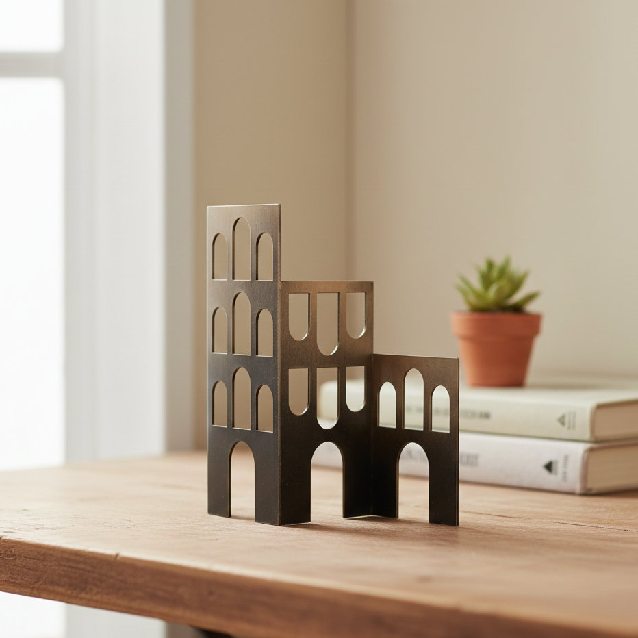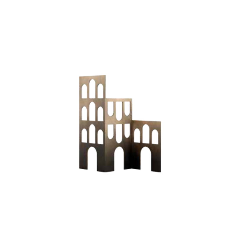 Il soprammobile Malo è un raffinato complemento d'arredo che fonde l'essenzialità del design contemporaneo con il fascino eterno dell'architettura classica. Realizzato con una struttura in metallo dalla finitura brunita e calda, questo oggetto si distingue per il suo profilo a scalare, che evoca lo skyline di un borgo antico o la solennità di un acquedotto romano.