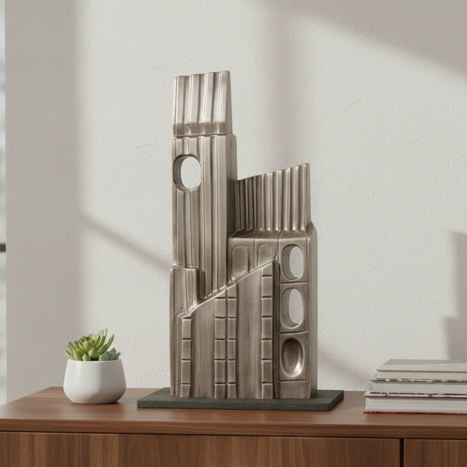 Metropolis non è un semplice oggetto decorativo, ma una vera e propria scultura in miniatura che cattura l'essenza vibrante e complessa della vita cittadina moderna. Con le sue linee verticali decise e le superfici scanalate, questo pezzo evoca il profilo dei grattacieli iconici che definiscono gli orizzonti delle più grandi capitali del mondo.