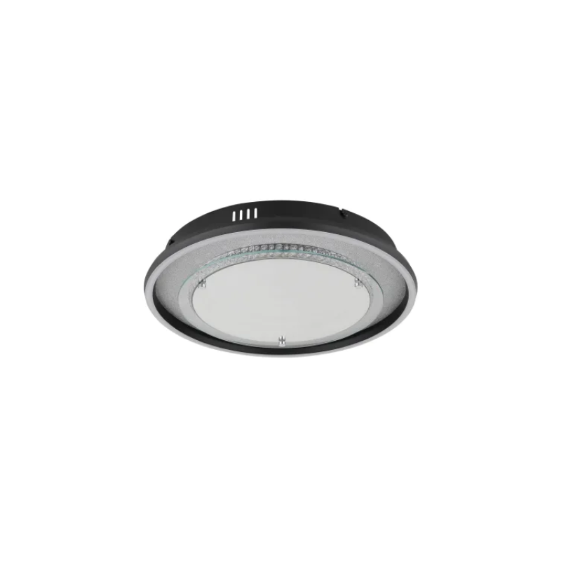 - Plafoniera alluminio nero satinato, metallo color argento, metallo cromato, vetro specchiato Effetto 3D, cristalli di plastica trasparente, plastica opale, Molteplici passaggi tramite interruttore a muro, Colore selezionabile, Funzione di memoria, Luce notturna