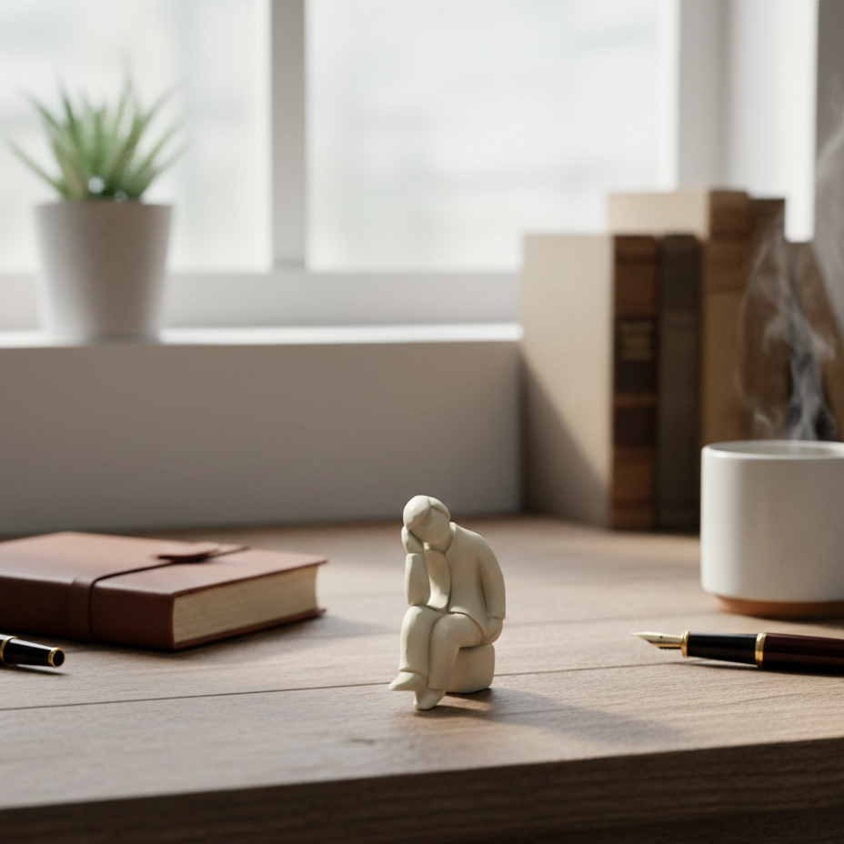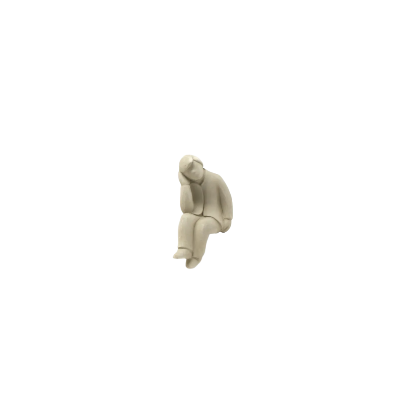L'immagine ritrae una piccola statuina monocromatica di colore bianco panna o grigio molto chiaro, con una finitura opaca che ricorda il gesso o la ceramica non smaltata.