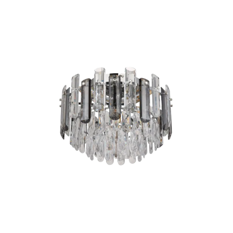 - Plafoniera metallo cromato, cristallo in acrilico trasparente, bacchette di vetro color fumè, trasparente
