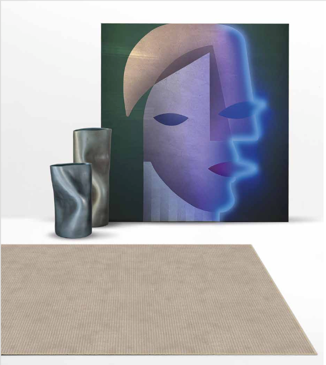 Tappeto base in lana rasata e righe in viscosa a rilievo. Bordatura a filo in tinta.