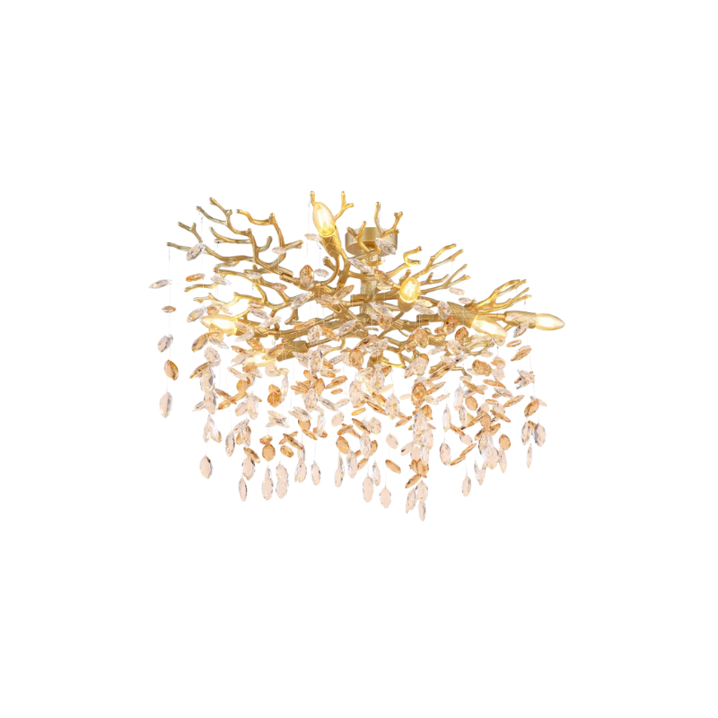 - Plafoniera metallo color oro satinato, cristalli di vetro ambra, trasparente