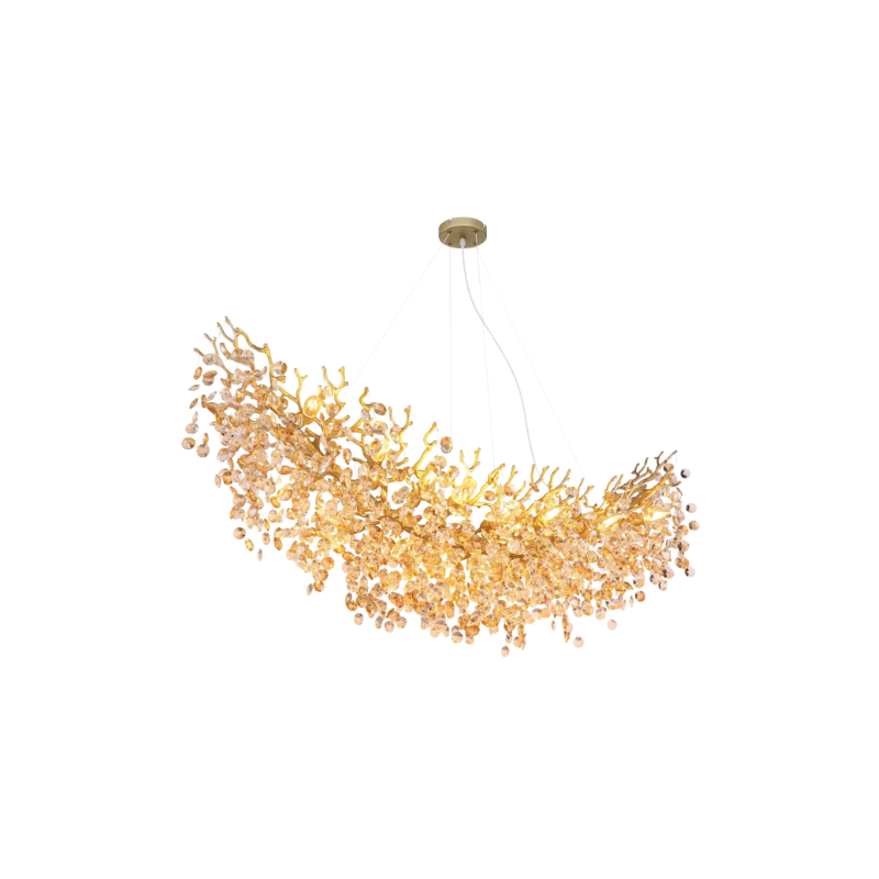 - Lampadario a candelabro metallo color oro satinato, cristalli di vetro ambra, trasparente, Altezza riducibile