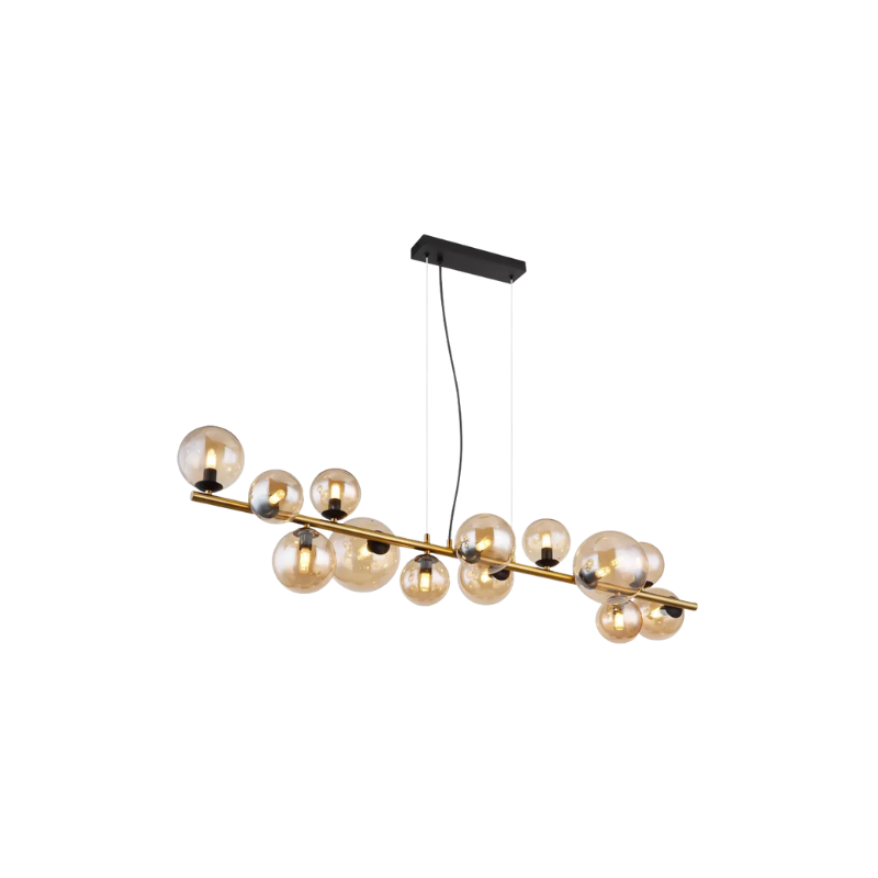 - Sospensione metallo nero satinato, metallo ottone satinato, vetro ambra, cavo PVC