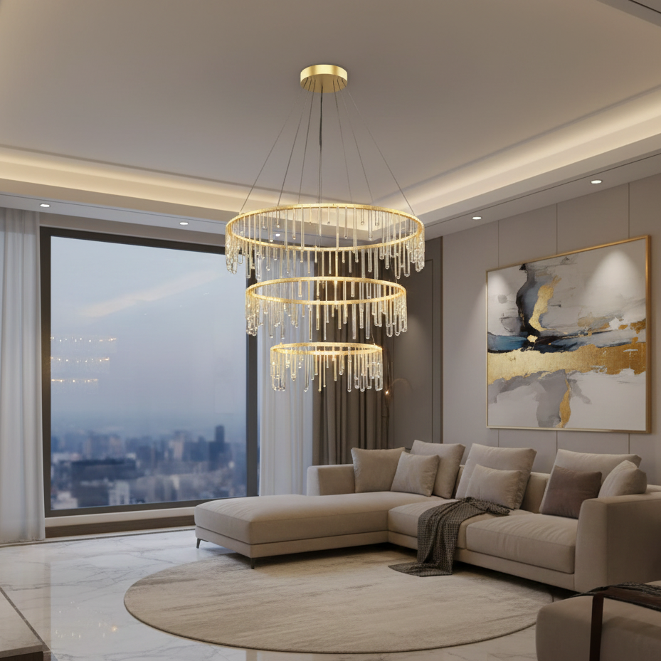 Scintilla è una sospensione a 3 livelli in ottone dal design moderno ed elegante, perfetta per illuminare con stile ampi spazi come soggiorni, loft e open space. I sei LED bifacciali da 10.7 Watt ciascuno garantiscono un'illuminazione potente e uniforme, con un flusso luminoso totale di 5508 Lumen e una temperatura colore di 3000K che crea un'atmosfera calda e accogliente. La sospensione è realizzata in ottone di alta qualità, con una finitura lucida che dona un tocco di raffinatezza a qualsiasi ambiente.