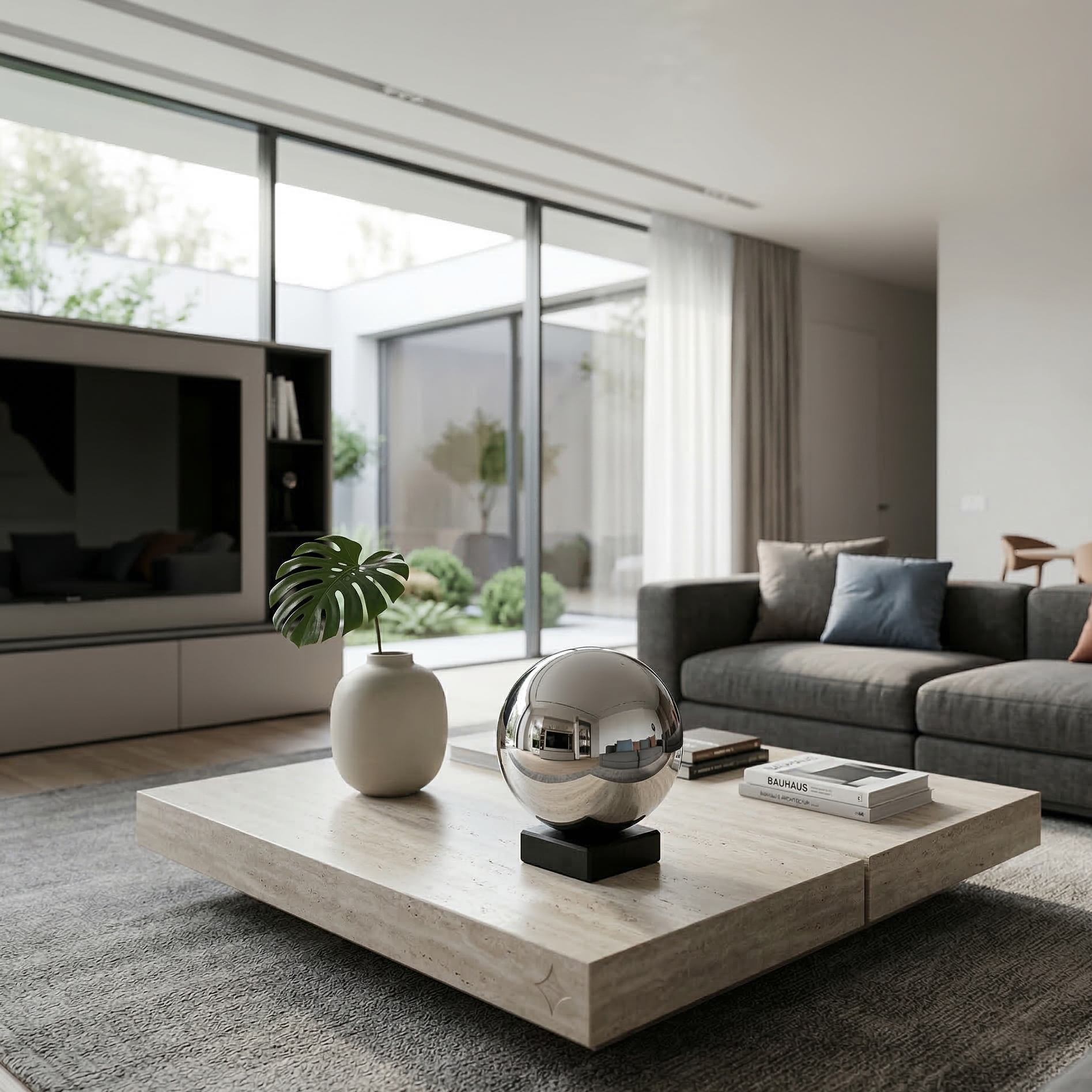 Questa scultura da tavolo non è un semplice oggetto decorativo, ma un esercizio di precisione formale. La perfetta sfericità dell’acciaio specchiato incontra la stabilità rigorosa di una base in marmo nero opaco, creando un contrasto visivo che cattura lo sguardo e riflette l’ambiente circostante.