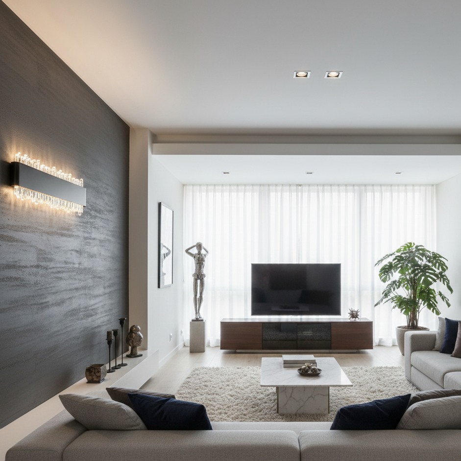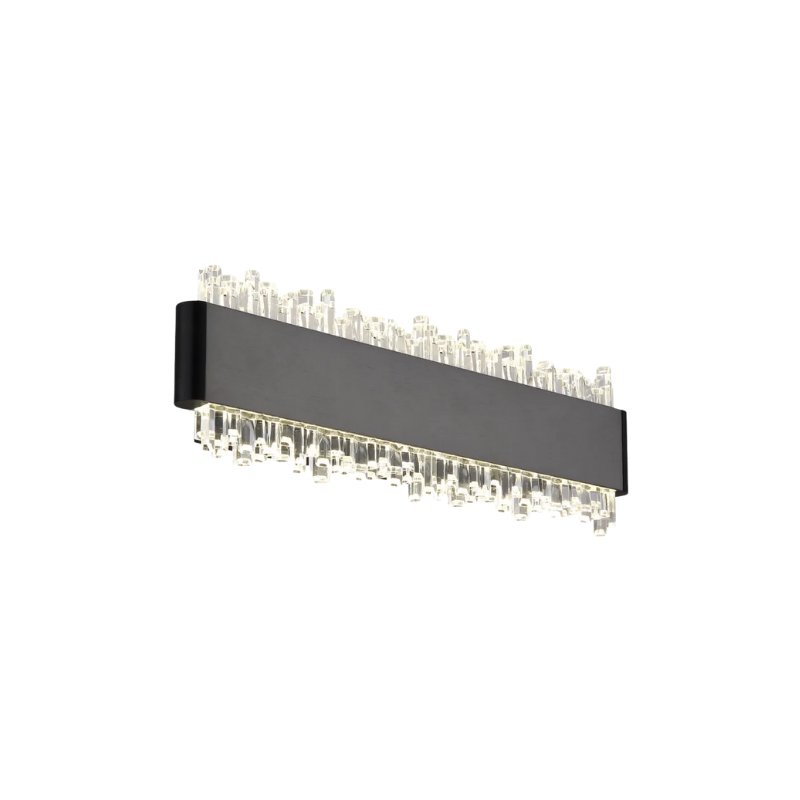 - Applique metallo nero satinato, alluminio grigio spazzolato, cristallo in acrilico trasparente, plastica nero satinato