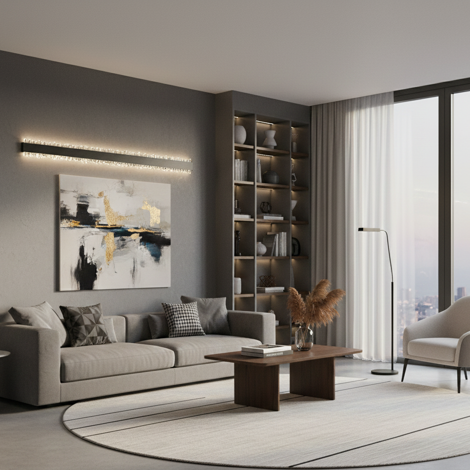 - Applique metallo nero satinato, alluminio grigio spazzolato, cristallo in acrilico trasparente, plastica nero satinato