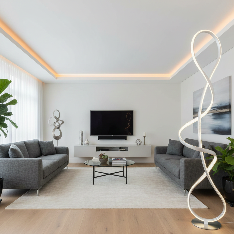 Il nome Swirl descrive perfettamente la sua struttura: un nastro luminoso in metallo che si avvolge su se stesso nello spazio, creando un gioco di curve morbide e avvolgenti.