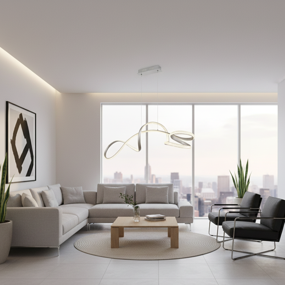 Il nome Swirl descrive perfettamente la sua struttura: un nastro luminoso in metallo che si avvolge su se stesso nello spazio, creando un gioco di curve morbide e avvolgenti.