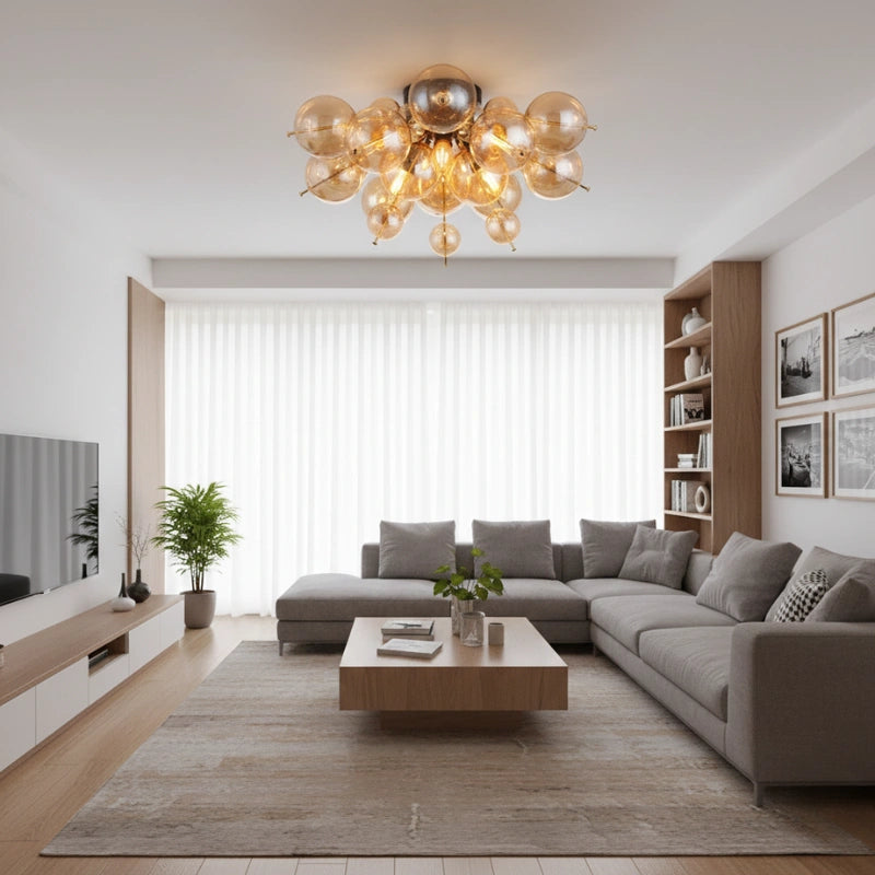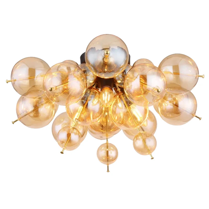 - Plafoniera metallo nero satinato, metallo color oro, palline di vetro ambra