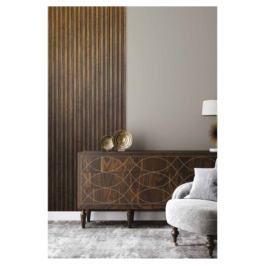 VELTHORA rappresenta l'evoluzione del rivestimento murale moderno: un pannello lamellare che trasforma le pareti in superfici architettoniche di carattere. Le lamelle verticali, finemente calibrate nelle proporzioni, generano un effetto visivo sofisticato e dinamico, conferendo continuità estetica e contemporaneità agli ambienti. Dimensionato 12,2 × 270 cm, si configura come soluzione modulare versatile, adatto sia a rivestimenti continui che a installazioni verticali autonome, assicurando coerenza progettuale e finitura professionale in ogni applicazione. La tecnologia idrorepellente integrata nella struttura lo qualifica come scelta ideale per contesti ad elevata umidità: bagni, spa, wellness center e zone umide. La costruzione leggera semplifica le operazioni di posa, riducendo tempi di installazione senza compromettere la qualità del risultato finale. Il pannello può essere installato con collanti specifici per ambienti asciutti o umidi ,oppure con colle professionali o siliconi. VELTHORA coniuga eleganza formale e affidabilità tecnica, ridefinendo gli standard del design murale contemporaneo.