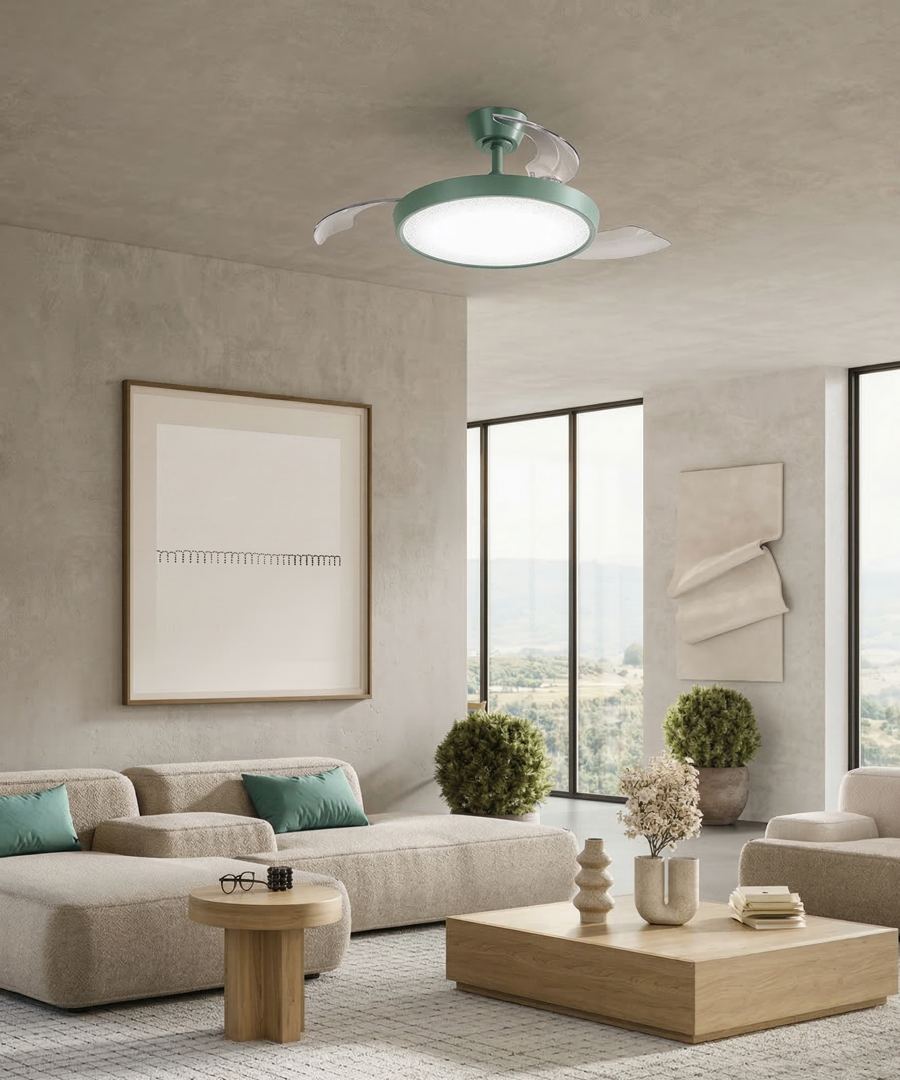 Eleganza invisibile e comfort totale. Non è solo un lampadario LED ultra-piatto, ma un sistema di ventilazione intelligente con pale a scomparsa. Quando è spento, è un punto luce dal design minimale; quando è acceso, le sue pale trasparenti si aprono per rigenerare l'aria con estrema silenziosità.