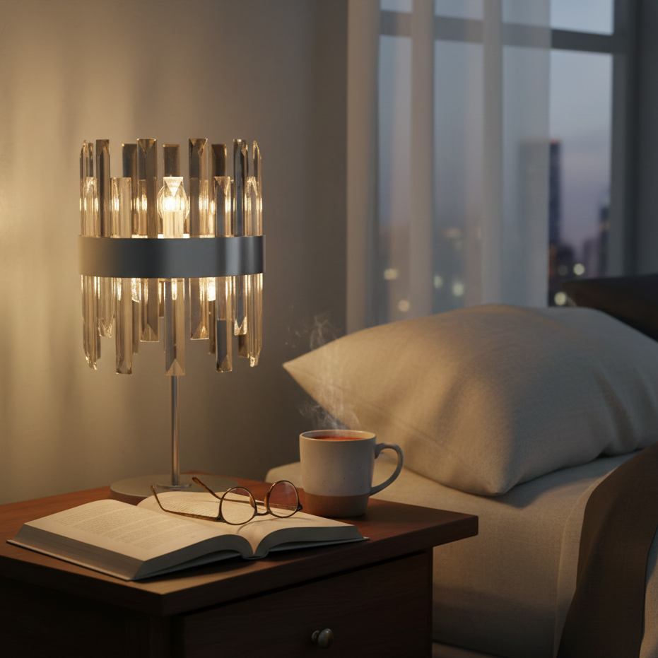 Zenna è una lampada da tavolo a 20 luci della collezione Zenna che si distingue per il suo design elegante e scenografico. I diffusori in cristallo al taglio di prismi creano un effetto luminoso scintillante e suggestivo, perfetto per illuminare con stile ampi spazi come soggiorni, loft e open space. La lampada è realizzata in metallo di alta qualità, con una finitura cromata che dona un tocco di lusso a qualsiasi arredamento.
