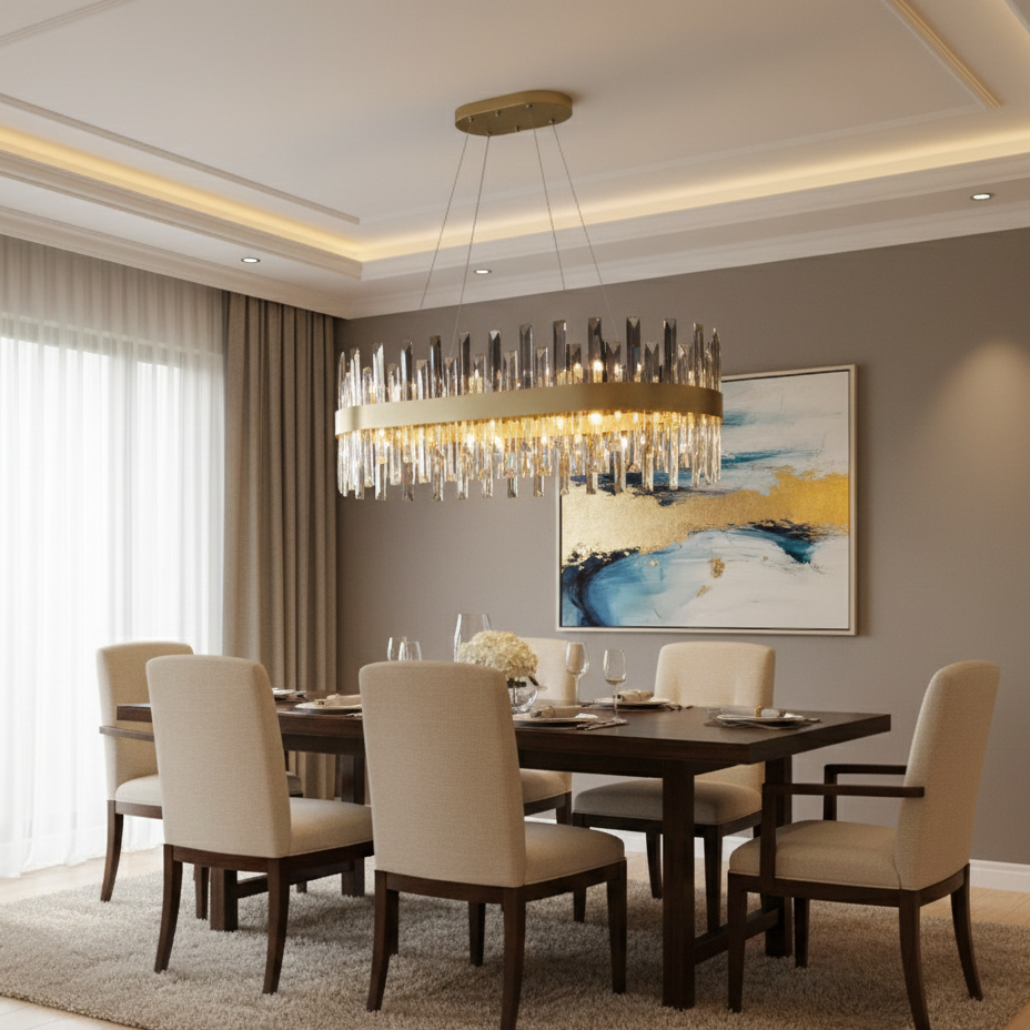 Zenna è una sospensione ovale a 20 luci della collezione Zenna che si distingue per il suo design elegante e scenografico. I diffusori in cristallo al taglio di prismi creano un effetto luminoso scintillante e suggestivo, perfetto per illuminare con stile ampi spazi come soggiorni, loft e open space. La sospensione è realizzata in metallo di alta qualità,con una finitura dorata che dona un tocco di lusso e raffinatezza a qualsiasi ambiente.